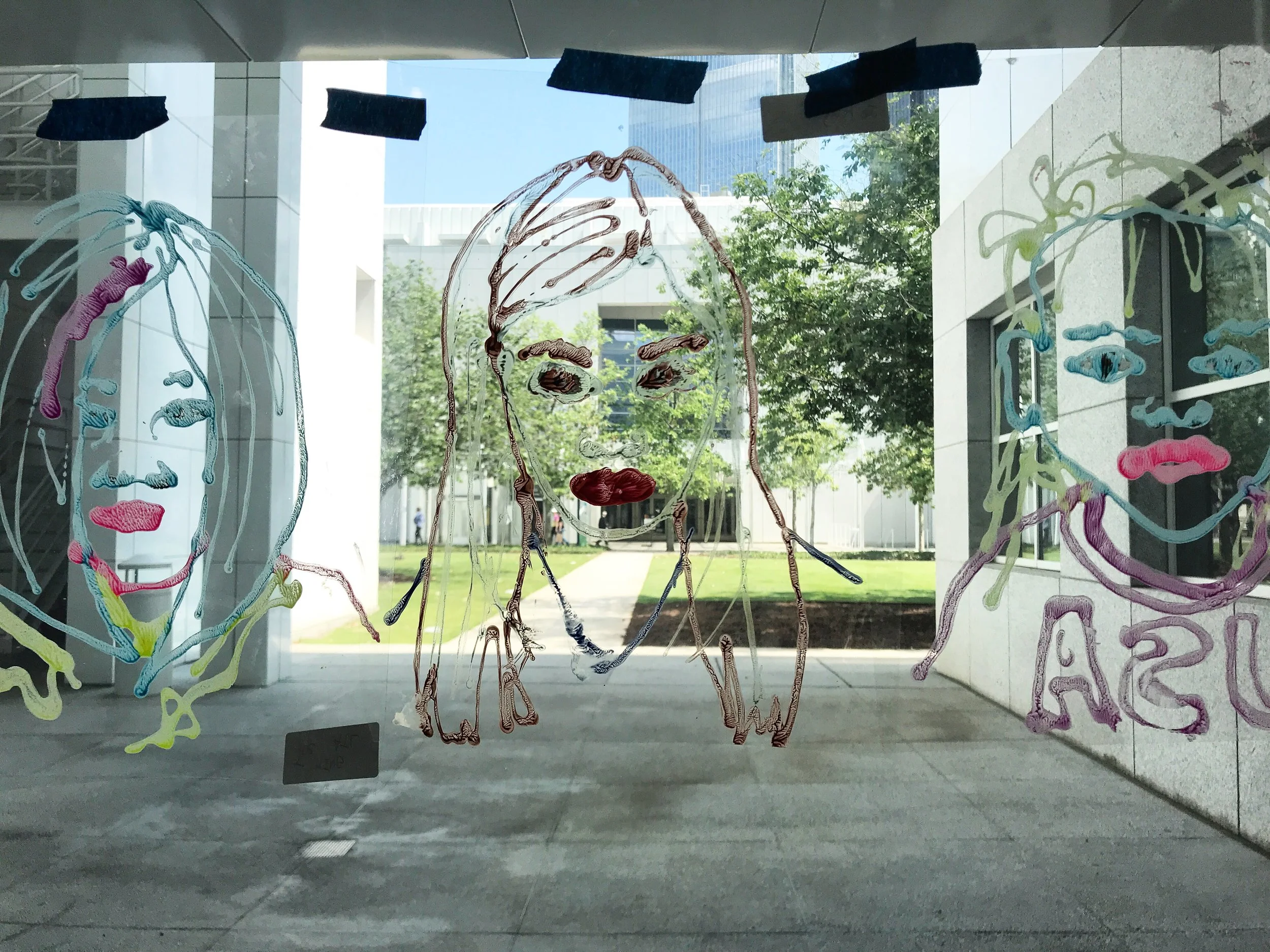 While occupying a retail storefront on Main Street for the ten day duration of Artfields 2021, people coming out for any the first time since the pandemic lockdown were drawn on the glass and mono prints were made and hung in the empty space.