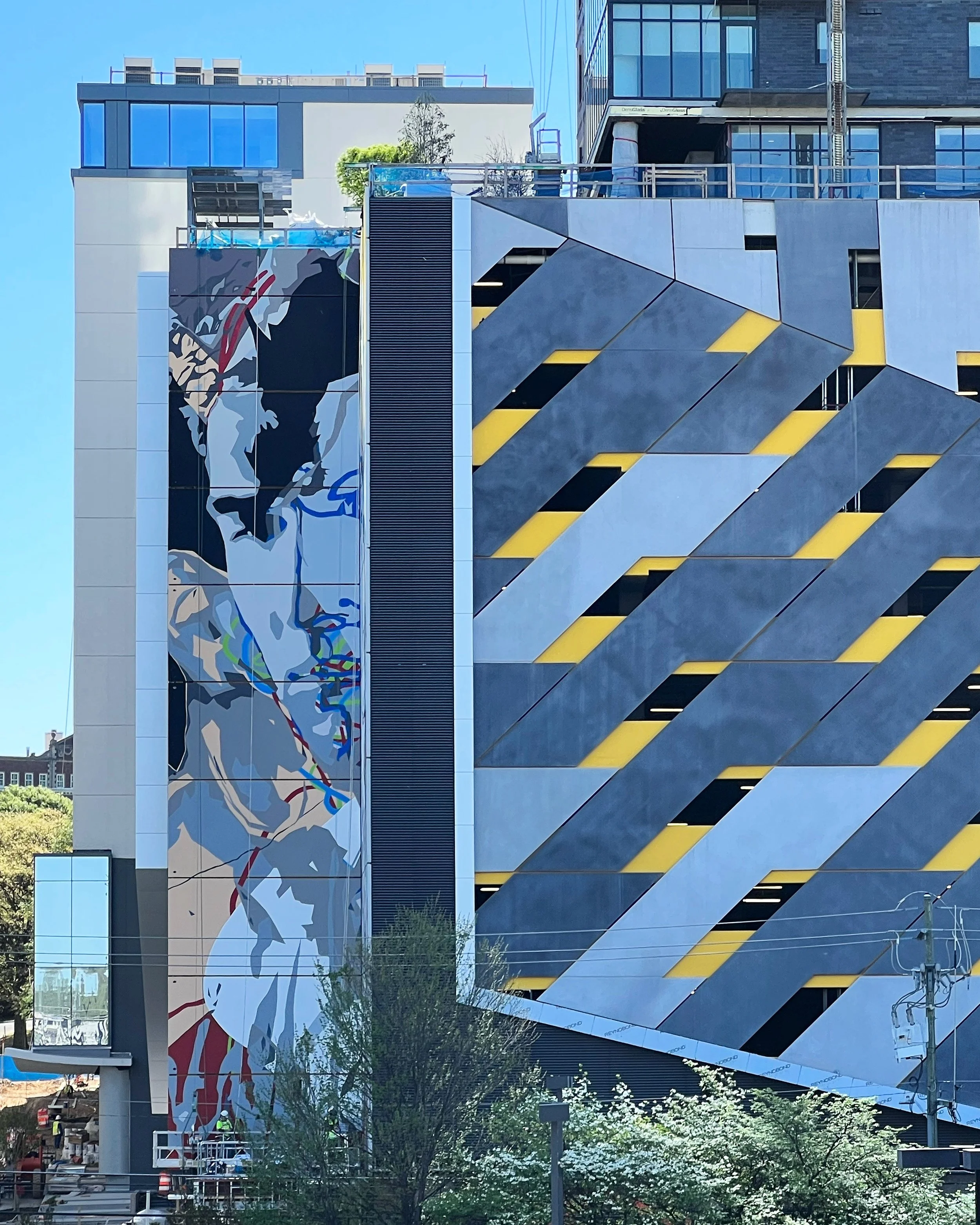 The project consists of two large murals going up at Midtown Union, the mixed- use project being developed by Granite Properties and MetLife Investment Management in Midtown Atlanta. The project consists of a Class-AA office tower, the Mira at Midtown Union residenFal tower, The Kimpton Wade hotel and 30,000 SF of retail and two murals by artist Joe Dreher aka JOEKINGATL and his team Krista Jones and Muhammad Suber.